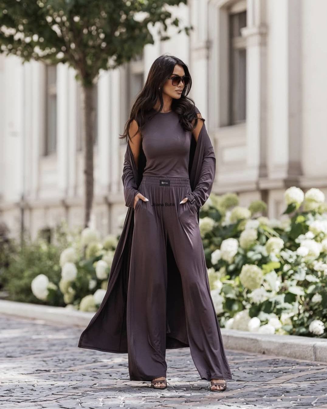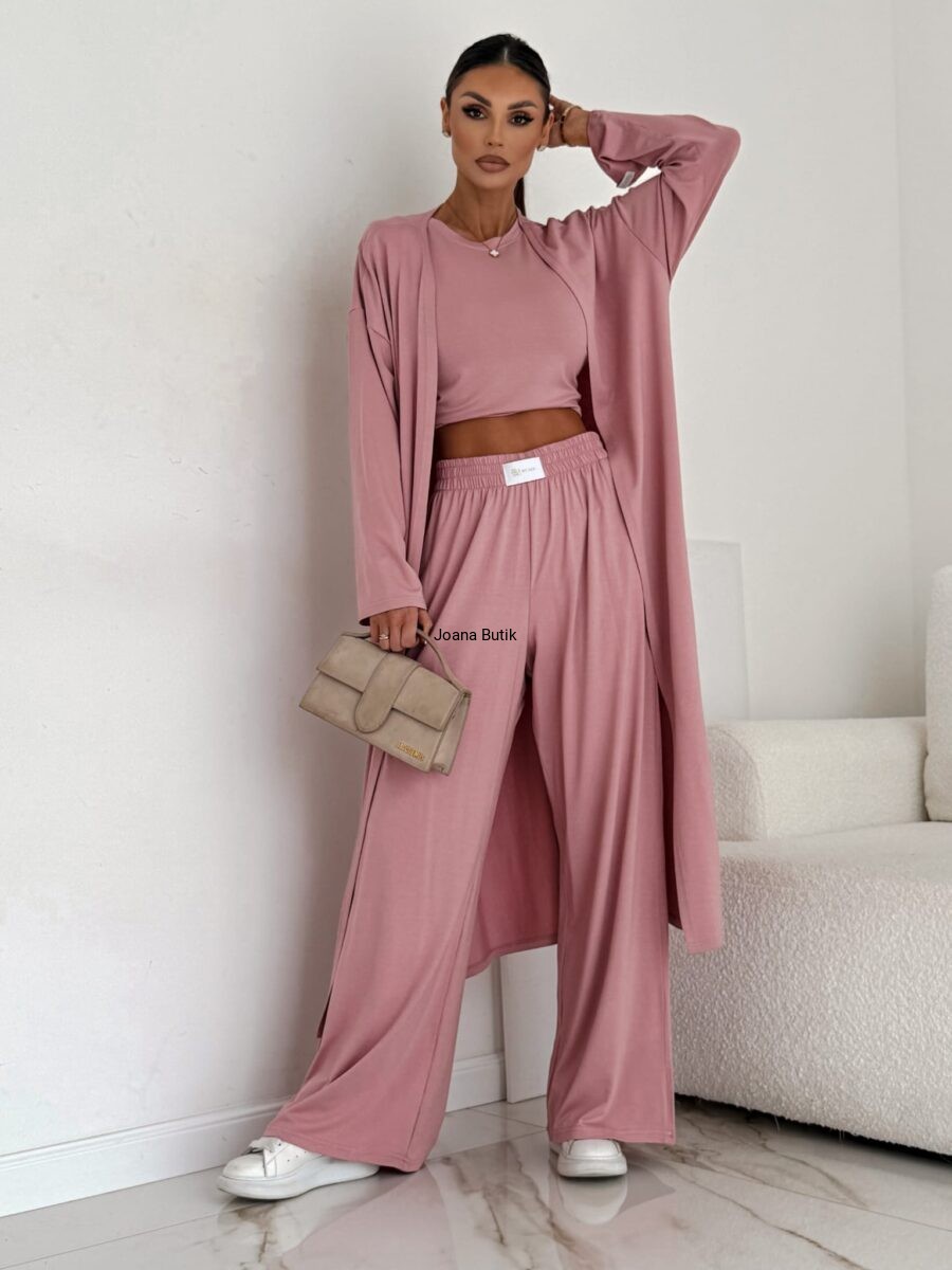 Komplet damski 3-częściowy – top, spodnie i narzutka Stylowy, kobiecy komplet z lekkiej, elastycznej dzianiny wiskozowej – idealny na codzienne stylizacje, spotkania i wyjazdy. Trzy doskonale dopasowane elementy tworzą spójną, elegancką całość.