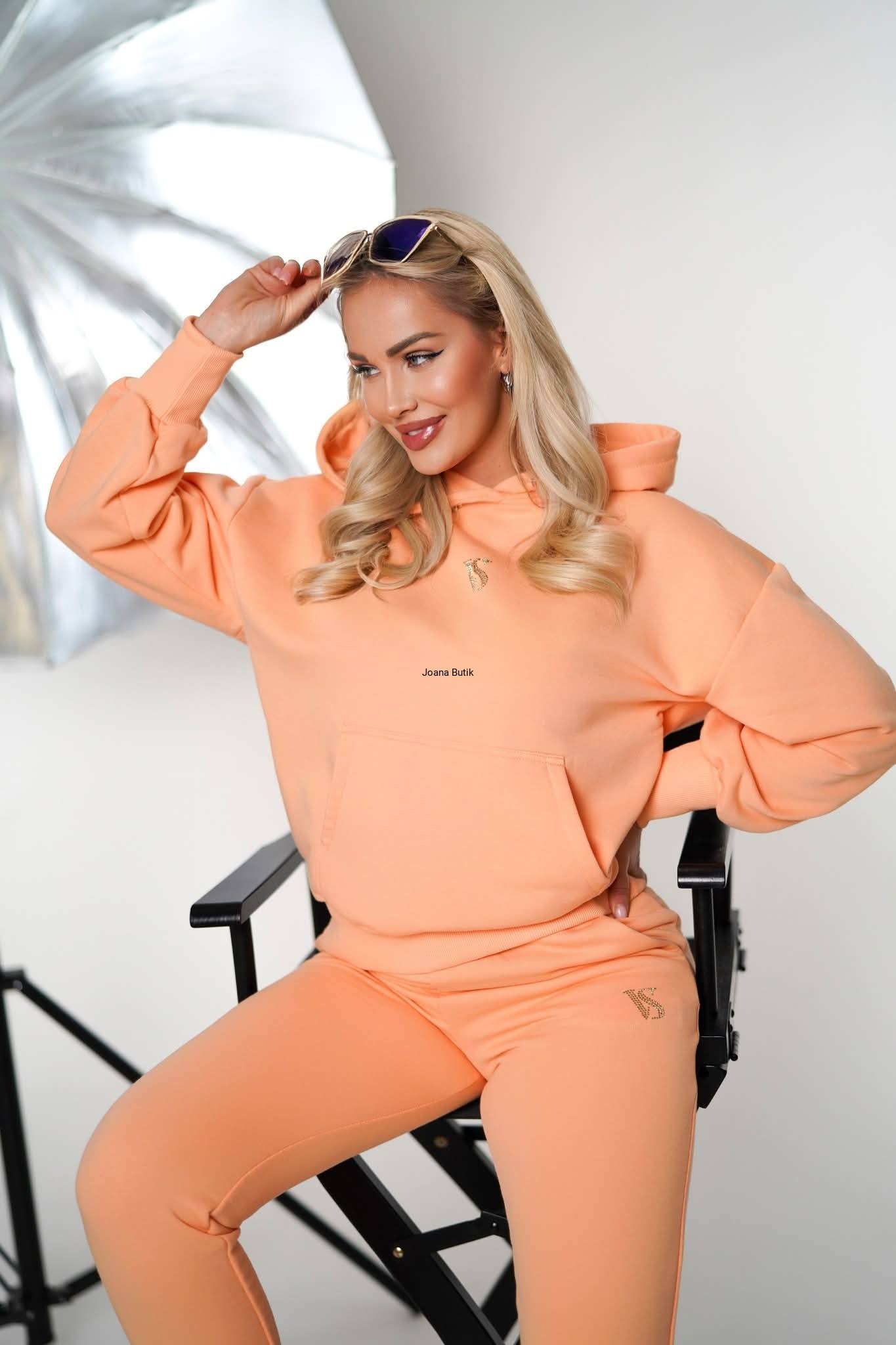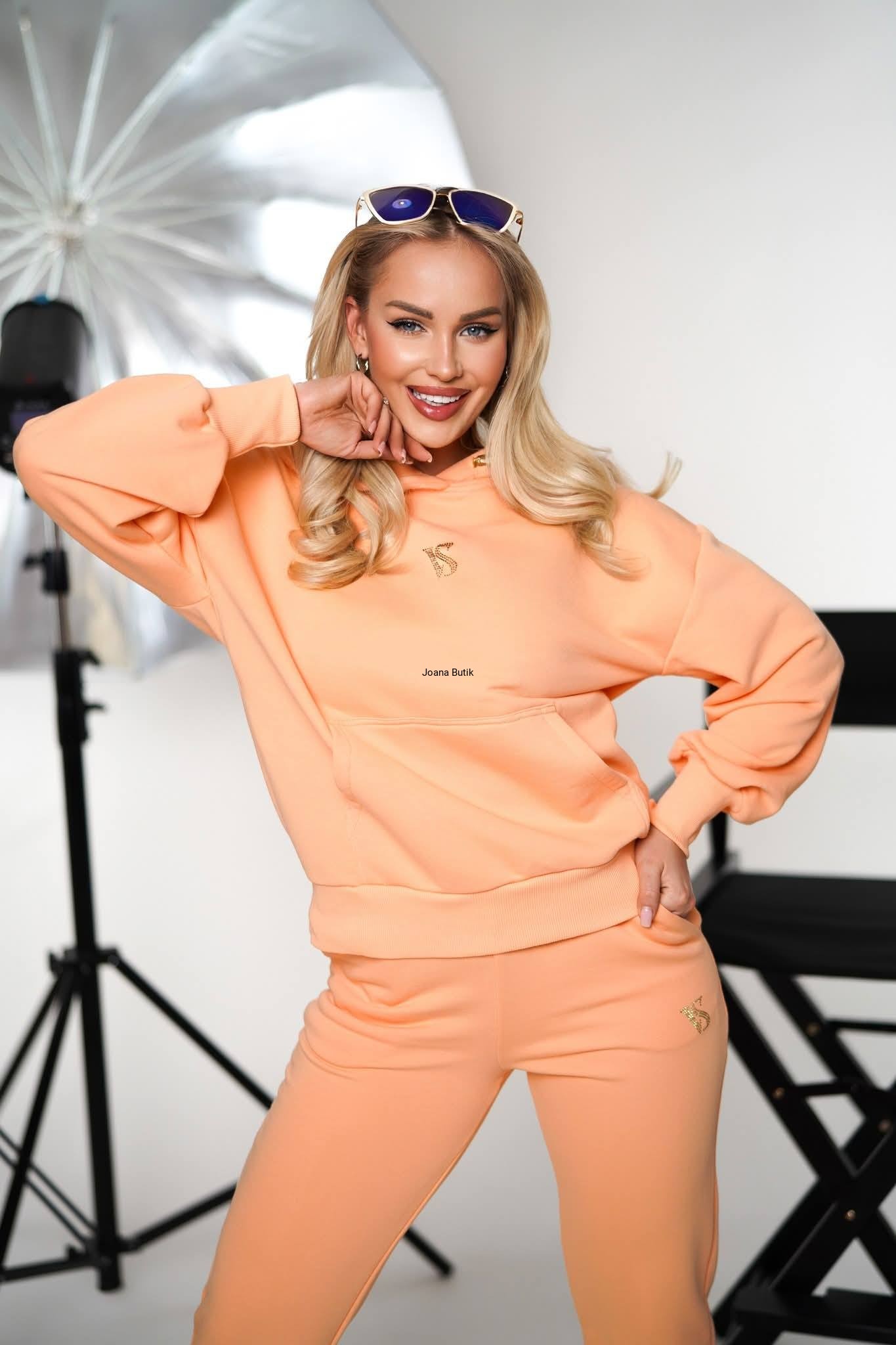Komplet dresowy z bawełnianej tkaniny. Spodnie na szerszej gumie, wyższy stan, posiadają kieszenie oraz delikatny, logowany wzór z błyszczących diamencików. Bluza z kapturem o lekko oversizowym fasonie. Posiada obniżona linię ramion oraz kieszonkę z przodu. Na przodzie również błyszczące logo. Najwyższa jakość i modny design. Produkcja Polska. Wymiary: S Bluza Całkowita długość: 63 cm Szerokość w biuście: 62 cm Rękaw od pachy: 45 cm Spodnie Szerokość w pasie: 31-39 cm Szerokość biodra: 42-49 cm Długość całkowita : 97 cm Stan: 33 cm M Bluza Całkowita długość: 64 cm Szerokość w biuście: 64 cm Rękaw od pachy: 46 cm Spodnie Szerokość w pasie: 33-41 cm Szerokość biodra: 44-51 cm Długość całkowita : 98 cm Stan: 34 cm