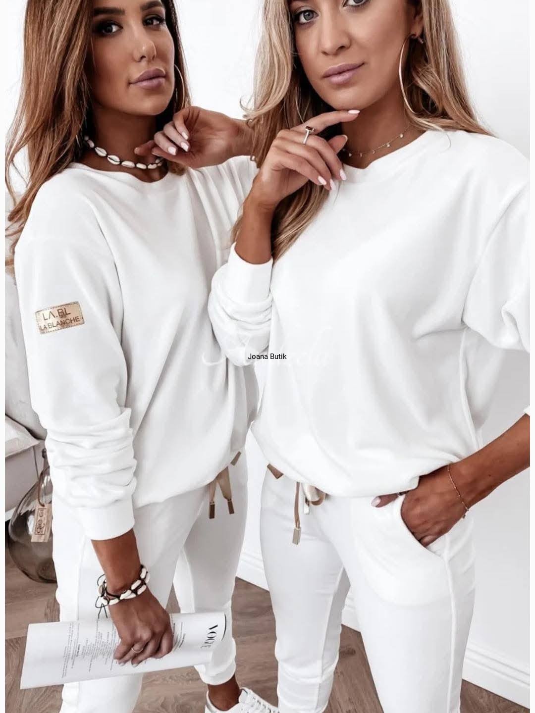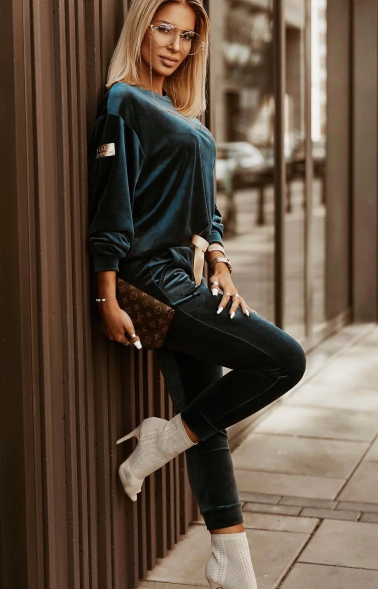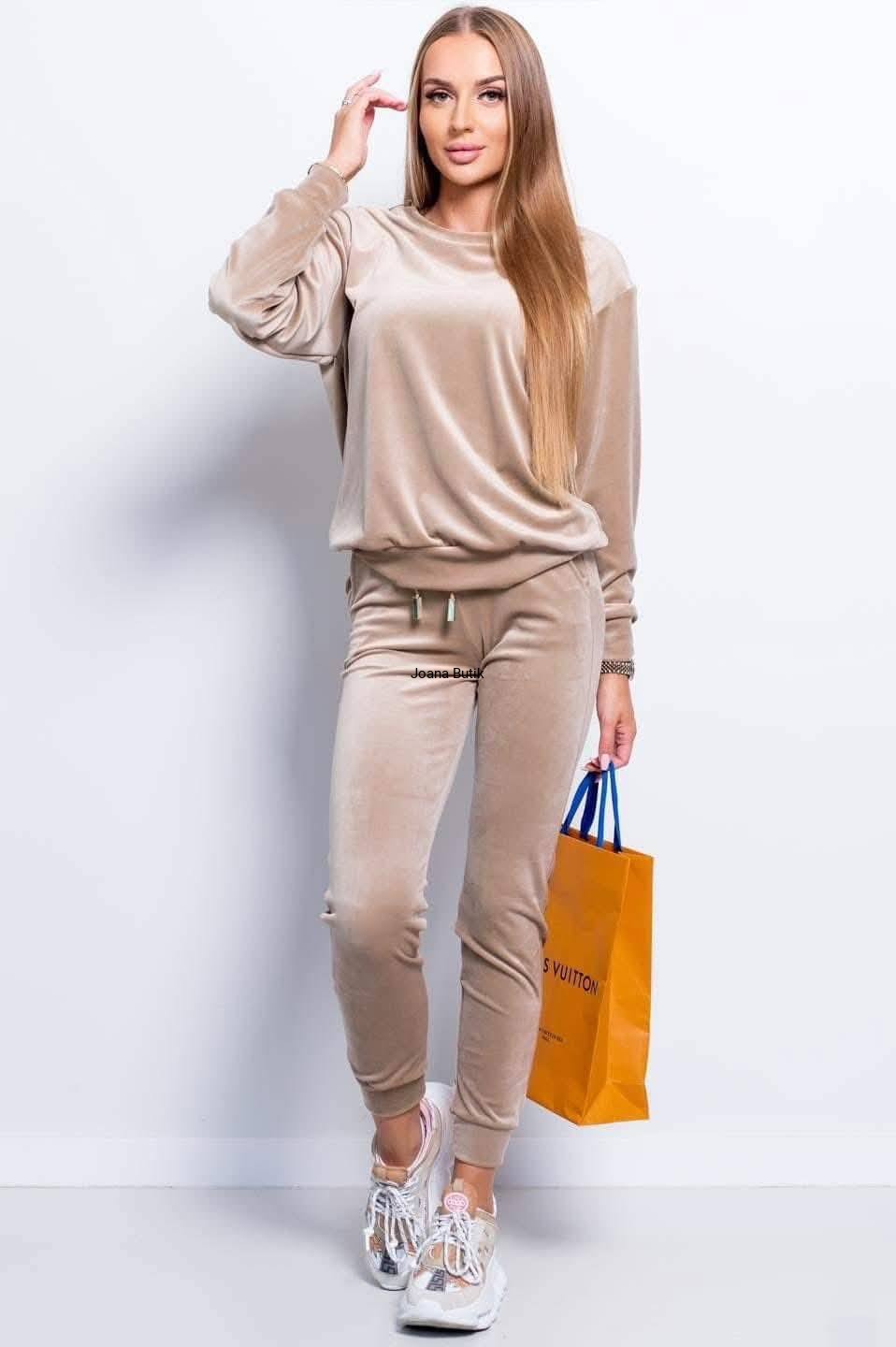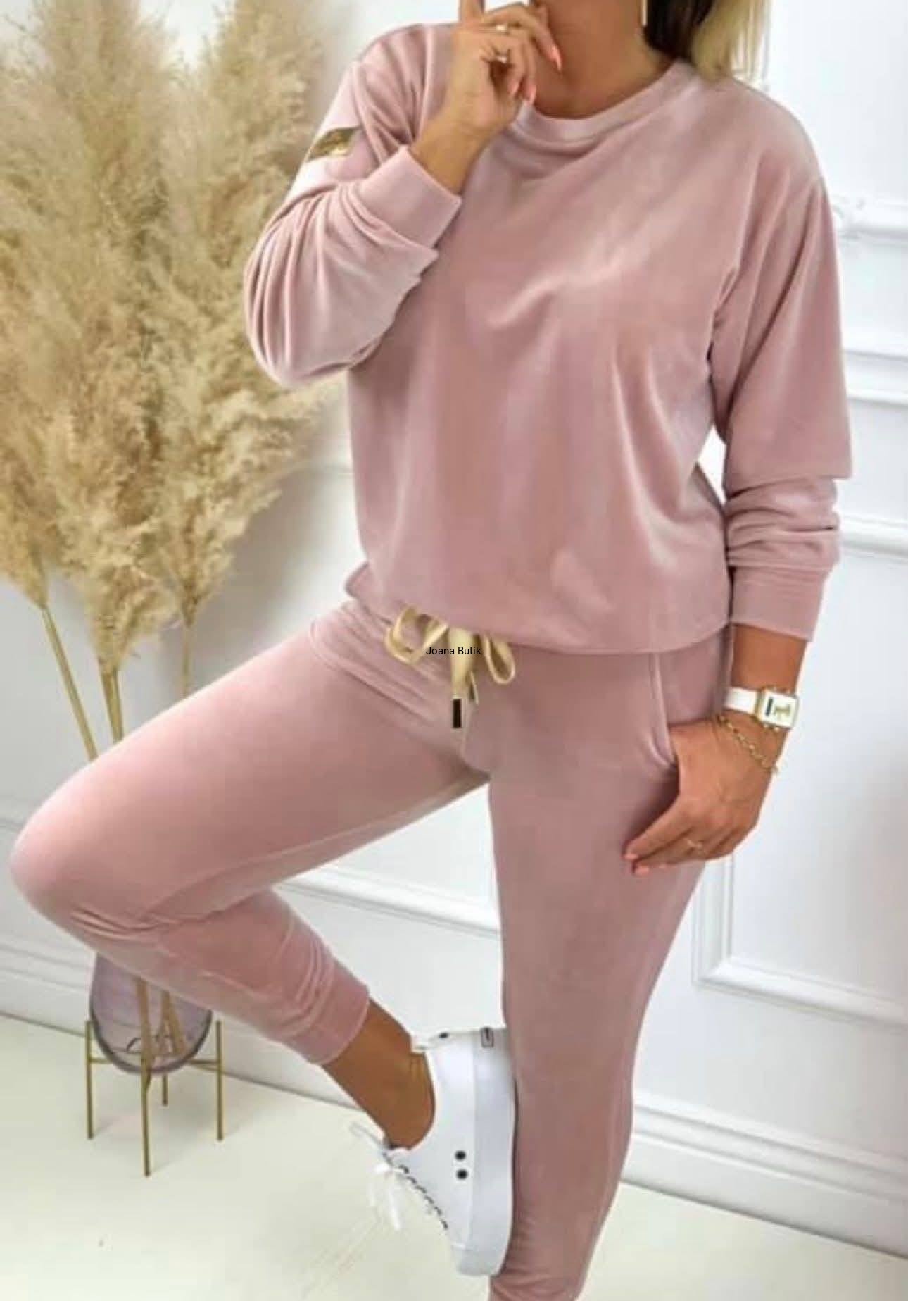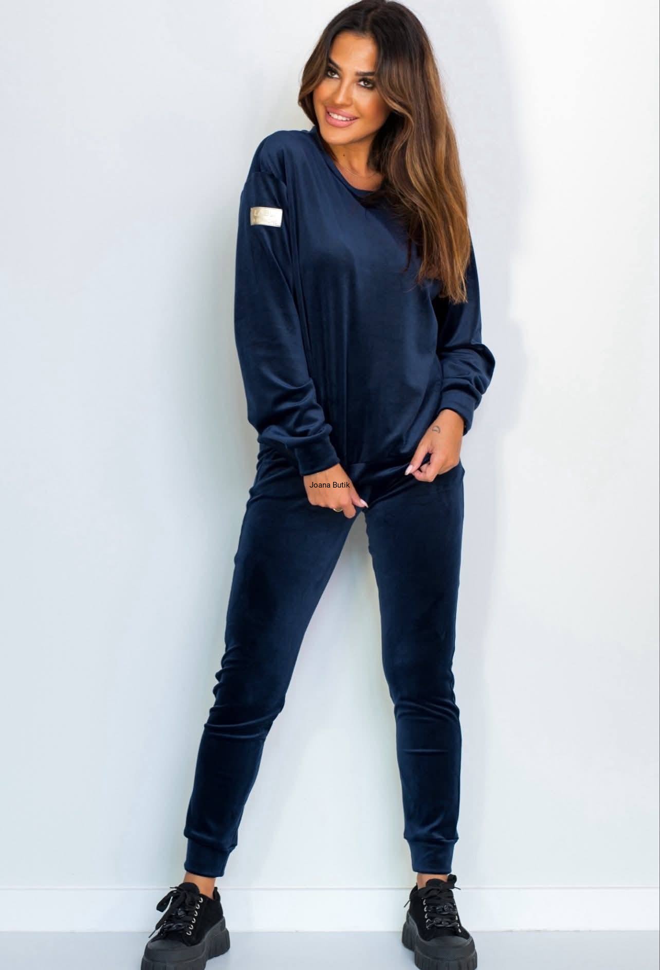 Welurowy komplet, wykonany z gładkiego i aksamitnego w dotyku materiału. Model posiada ściągacze przy nogawkach i rękawach oraz funkcjonalne, wkładane kieszenie po bokach w przedniej części spodni. W pasie znajduje się gumka z ozdobną, satynową tasiemką. Bluza wyróżnia się naszywką w złotym kolorze, która znajduje się na jednym z rękawów. Ten model najlepiej zaprezentuje się w luźnym wydaniu, w zestawieniu ze sportowym obuwiem. Produkt dostępny jest w wielu wersjach kolorystycznych. Bluza: * materiał elastyczny * zaokrąglony dekolt * naszywka na rękawie z logotypem * ściągacz w rękawach i na dole Spodnie: * materiał elastyczny * delikatna w dotyku tkanina * ściągacz w pasie z ozdobną tasiemką * kieszenie po bokach * nogawki zakończone ściągaczem p>Wymiary: 36/S Bluza: Dł. całkowita - 61 cm Szer. w ramionach - 47 cm Szer. od pachy do pachy - 53 cm Szer. w talii - 51 cm Szer. na dole - 43 cm Dł. rękawa od ramienia - 57 cm Dł. rękawa od pachy - 50 cm Szer. w bicepsie - 22 cm Spodnie: Dł. całkowita - 98 cm Dł. nogawki od kroku - 72 cm Wys. stanu przód - 26 cm Wys. stanu tył - 32 cm Szer. w pasie - 30-47 cm Szer. w biodrach - 40 cm Szer. w udzie - 23 cm Szer. nogawki na dole - 11 cm 38/M Bluza: Dł. całkowita - 62 cm Szer. w ramionach - 48 cm Szer. od pachy do pachy - 55 cm Szer. w talii - 53 cm Szer. na dole - 45 cm Dł. rękawa od ramienia - 57 cm Dł. rękawa od pachy - 50 cm Szer. w bicepsie - 22 cm Spodnie: Dł. całkowita - 98 cm Dł. nogawki od kroku - 72 cm Wys. stanu przód - 26 cm Wys. stanu tył - 32 cm Szer. w pasie - 31-49 cm Szer. w biodrach - 42 cm Szer. w udzie - 23 cm Szer. nogawki na dole - 11 cm 40/L Bluza: Dł. całkowita - 63 cm Szer. w ramionach - 49 cm Szer. od pachy do pachy - 58 cm Szer. w talii - 55 cm Szer. na dole - 48 cm Dł. rękawa od ramienia - 57 cm Dł. rękawa od pachy - 50 cm Szer. w bicepsie - 23 cm Spodnie: Dł. całkowita - 98 cm Dł. nogawki od kroku - 72 cm Wys. stanu przód - 26 cm Wys. stanu tył - 32 cm Szer. w pasie - 32-51 cm Szer. w biodrach - 45 cm Szer. w udzie - 24 cm Szer. nogawki na dole - 12 cm 42/XL Bluza: Dł. całkowita - 64 cm Szer. w ramionach - 50 cm Szer. od pachy do pachy - 60 cm Szer. w talii - 57 cm Szer. na dole - 50 cm Dł. rękawa od ramienia - 57 cm Dł. rękawa od pachy - 50 cm Szer. w bicepsie - 23 cm Spodnie: Dł. całkowita - 98 cm Dł. nogawki od kroku - 72 cm Wys. stanu przód - 26 cm Wys. stanu tył - 32 cm Szer. w pasie - 33-53 cm Szer. w biodrach - 47 cm Szer. w udzie - 24 cm Szer. nogawki na dole - 12 cm
