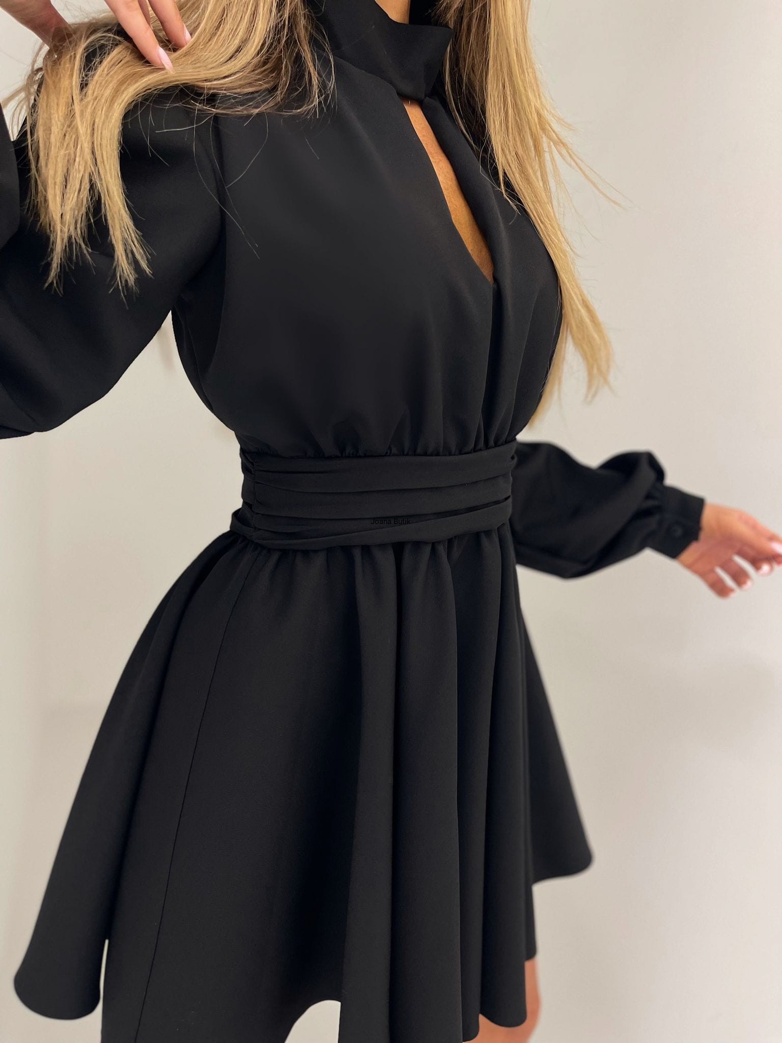 Sukienka zapinana na kryty zamek z tyłu. Sukienka rozkloszowana z dekoltem, elegancka o lużnym i zwiewnym fasonie co sprawia że jest idealna na różne okazje. Jest w kolorze czarnym, beżowym i burgund pasuje do wielu okazji. Szczegóły: - dekolt v - zapinana na zamek - rozkloszowana - bufiaste rękawy Występuje w dwóch rozmiarach: S/M i L/XL Wymiary Rozmiar XS/S Długość całkowita: 85 cm Szerokość w ramionach: 40 cm x 2 Szerokość od pachy do pachy: 49 cm x 2 Pas: 36 cm x 2 Długość wewnętrzna rękawa: 49 cm Rozmiar M Długość całkowita: 88 cm Szerokość w ramionach: 41 cm x 2 Szerokość od pachy do pachy: 51 cm x 2 Pas: 37 cm x 2 Długość wewnętrzna rękawa: 50 cm MATERIAŁ NIE UCIĄGA SIĘ !!! Skład: 50% poliester 40% wiskoza 10% elastan