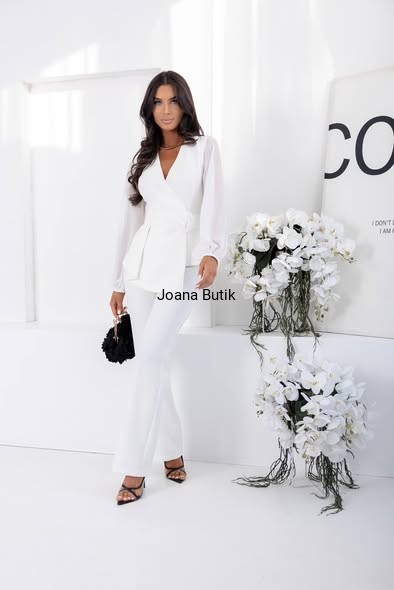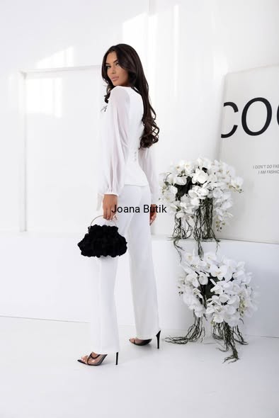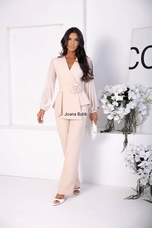 Są takie modele, które od pierwszego spojrzenia robią wrażenie – i właśnie do nich należy komplet Madison w odcieniu pudrowego różu. Kobiecy, elegancki, dopracowany w każdym detalu. To propozycja dla kobiet, które chcą wyglądać stylowo, ale jednocześnie czuć się swobodnie i komfortowo przez cały dzień. Bluzka o kopertowym kroju pięknie podkreśla dekolt i talię, a subtelna aplikacja w formie róży dodaje całości wyjątkowego charakteru. Delikatnie bufiaste rękawy z lekkiego, zwiewnego materiału nadają stylizacji lekkości i elegancji. Spodnie o prostym, lekko rozszerzanym kroju wydłużają nogi i wysmuklają sylwetkę, tworząc harmonijną, kobiecą linię. To komplet idealny na przyjęcia rodzinne, komunie, chrzciny, eleganckie kolacje, ale również wtedy, gdy po prostu chcesz wyglądać wyjątkowo. Cechy produktu: kolor: pudrowy róż fason: elegancki komplet (bluzka + spodnie) bluzka o kopertowym kroju ozdobna róża w talii długie, delikatnie bufiaste rękawy zakończone gumką spodnie z prostą, lekko rozszerzaną nogawką materiał komfortowy, pięknie układający się na sylwetce Stylizacja: Komplet Madison świetnie wygląda w połączeniu z jasnymi szpilkami lub sandałkami na obcasie oraz małą kopertówką. Możesz dobrać złotą biżuterię, by podkreślić elegancki charakter stylizacji, albo postawić na minimalistyczne dodatki i pozwolić, by to komplet grał główną rolę. Wymiary; 34 - bluzka biust 80 cm, talia 64 cm, spodnie pas gumka 31 cm, długość 108 cm 36 - bluzka biust 84 cm, talia 68 cm, spodnie pas gumka 33 cm, długość 108 cm 38 - bluzka biust 88 cm, talia 72 cm, spodnie pas gumka 35 cm, długość 109 cm 40 - bluzka biust 92 cm, talia 76 cm, spodnie pas gumka 37 cm, długość 109 cm 42 - bluzka biust 96 cm, talia 80 cm, spodnie pas gumka 39 cm, długość 110 cm 44 - bluzka biust 100 cm, talia 84 cm, spodnie pas gumka 41 cm, długość 110 cm 46 - bluzka biust 104 cm, talia 88 cm, spodnie pas gumka 43 cm, długość 111 cm