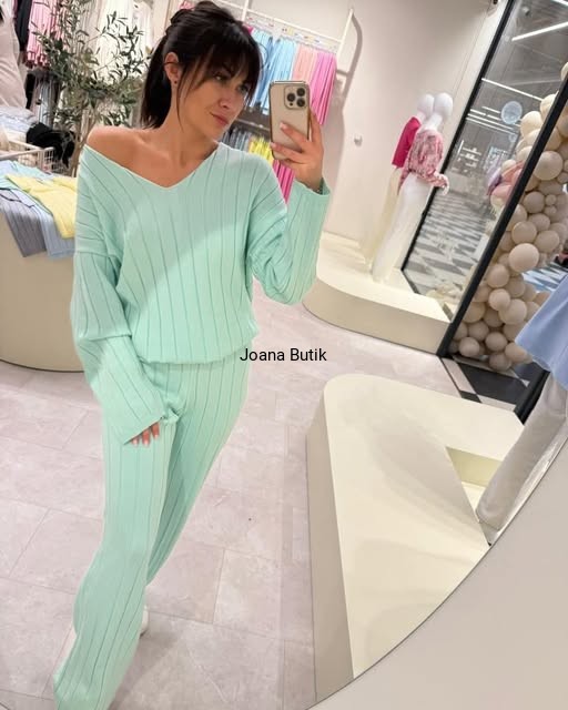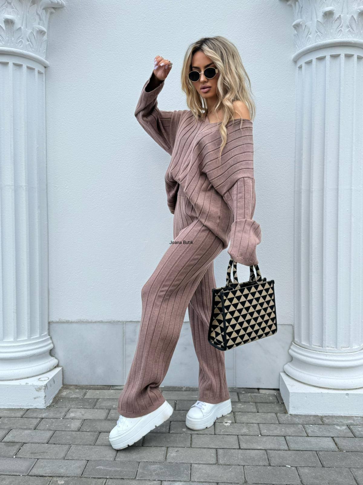 Komplet składa się z oversize’owego swetra z długimi rękawami oraz spodni z wysokim stanem, uszytych z tej samej, przyjemnej w dotyku dzianiny. Sweter zakładany przez głowę, z dekoltem w serek, zdobią ozdobne pionowe przeszycia, które optycznie wydłużają sylwetkę i dodają całości subtelnej elegancji. Szerokie nogawki spodni oraz ich pionowy wzór doskonale współgrają z górą, tworząc spójną, harmonijną stylizację idealną zarówno na co dzień, jak i na bardziej casualowe wyjścia. Skład: 50% wiskoza, 30% kaszmir, 20% elastan BLUZKA Rozmiar Uniwersalny : Długość całkowita: 66 cm Szerokość od pachy do pachy: od 120 cm, uciąga się do 130 cm Długość rękawa od pachy: 41 cm SPODNIE Rozmiar Uniwersalny : Długość całkowita: 107 cm Stan: 36 cm Obwód w pasie: od 58 cm, uciąga się do 74 cm Obwód w biodrach: od 78 cm, uciąga się do 94 cm