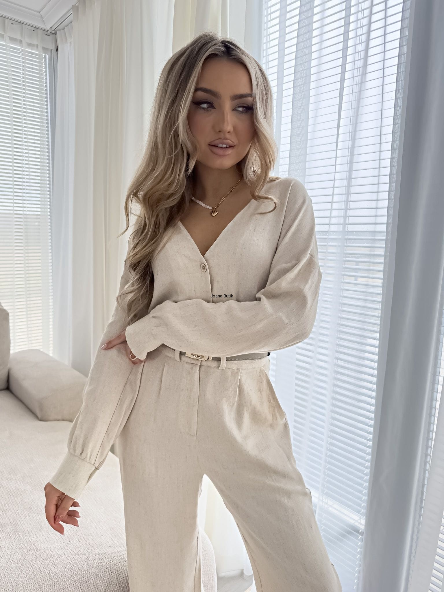 Komplet Mykonos składający się z koszuli i spodni. Koszula zapinana na kokosowe guziki, posiada dłuższy tył. Dekolt w serek. Spodnie posiadają szlufki, zapinane na suwak i guzik. Zestaw można wykorzystać również osobno- koszula świetnie sprawdzi się w zestawieniu z jeansami lub szortami, a spodnie będą pasowały do topów. Skład: 50% len, 50% bawełna KOSZULA: Wymiary XS: Obwód w biuście: 110 cm Długość całkowita: 60 cm przód, 70 cm tył Długość rękawa od dekoltu: 71 cm Wymiary S: Obwód w biuście: 114 cm Długość całkowita: 61 cm, 71 cm tył Długość rękawa od dekoltu: 71,5 cm Wymiary M: Obwód w biuście: 118 cm Długość całkowita: 62 cm przód, 72 cm tył Długość rękawa od dekoltu: 72 cm Wymiary L: Obwód w biuście: 122 cm Długość całkowita: 63 cm przód, 73 cm tył Długość rękawa od dekoltu: 72,5 cm SPODNIE: Wymiary XS: Długość całkowita: 110cm Wysokość stanu:34 cm Obwód w pasie: 64 cm Obwód w biodrach: 98 cm Wymiary S: Długość całkowita: 111cm Wysokość stanu: 34 cm Obwód w pasie: 66 cm Obwód w biodrach: 102 cm Wymiary M: Długość całkowita: 112 cm Wysokość stanu: 35 cm Obwód w pasie: 68 cm Obwód w biodrach: 106cm Wymiary L: Długość całkowita: 113 cm Wysokość stanu: 35 cm Obwód w pasie: 70 cm Obwód w biodrach: 110cm Ubrania mierzone na płasko! Poszczególne wymiary mogą różnić się +/- 2 cm.