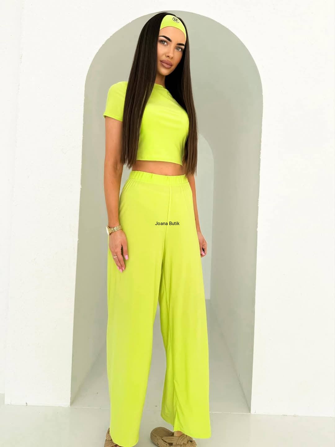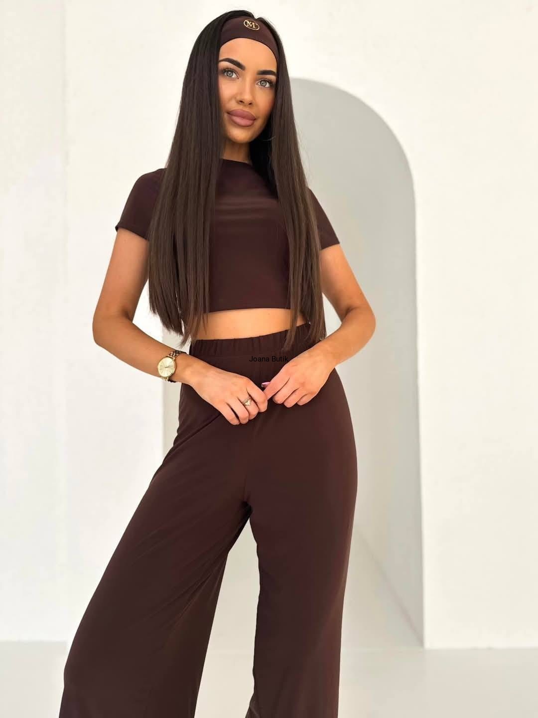 Stylowy komplet wykonany z wysokogatunkowego materiału niezwykle komfortowego dla ciała, przewiewnego i elastycznego. Set składa się z trzech części: ze spodni, bluzki na krótki rękaw oraz opaski na włosy. Bluzka wykonana z podwójnego materiału na krótki rękaw. Spodnie z gumką w pasie o prostym, klasycznym fasonie idealne na ciepłe dni. Opaska na włosy to kropka "nad i" całej stylizacji. Haftowane logo umieszczone po boku nadaje całości charakteru i podkreśla styl. Produkt polski- rozmiar uniwersalny. Wymiary: Top biust 72 cm- 96 cm max długość 39 cm spodnie pas 60 cm- 82 cm biodra 88 cm- 120 cm długość całkowita 109 cm długość nogawki od kroku 79 cm stan 29 cm