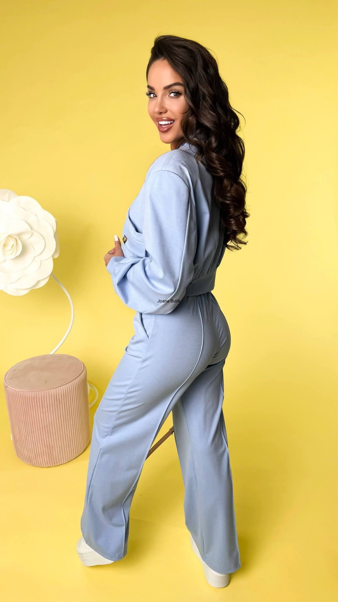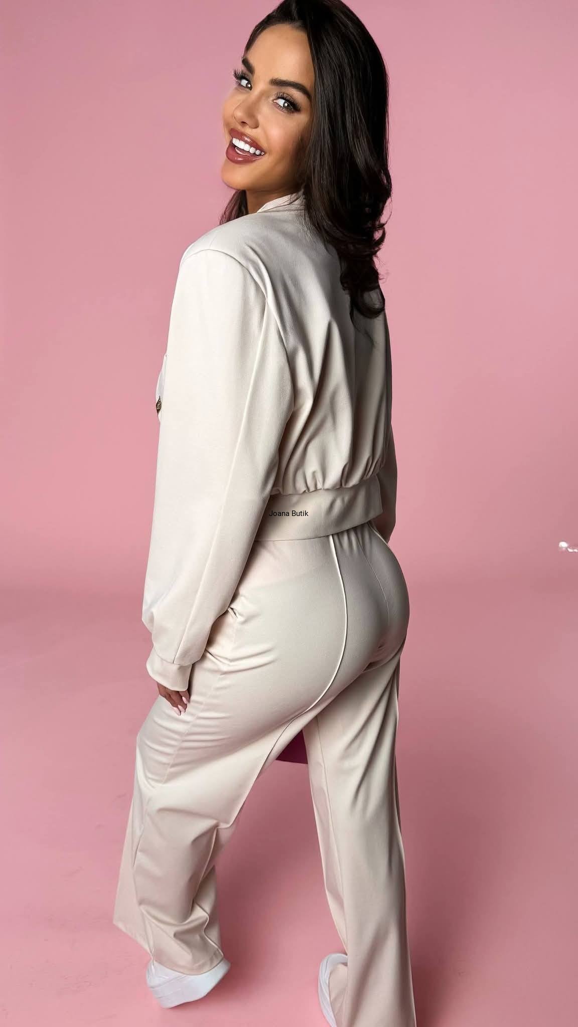 Fenomenalny komplet z materiału dresowego w stylu sportowej elegancji. Set składa się z bomberki oraz spodni. Bomberka zapinana na złote napy, posiada szersze ramiona z poduszkami oraz skośne kieszenie i zwężany dół co fantastycznie modeluje sylwetkę kształtując talię. Bomberka posiada podszewkę. Spodnie z wysokim stanem oraz pionowymi przeszyciami wzdłuż nogawek co optycznie wydłuża nogi. Spodnie posiadają szeroką gumę w pasie oraz boczne kieszonki. Całość ozdobiona dyskretnym, złotym logo La Diva. WYMIARY KURTKI S: od pachy do pachy 106 cm długość całkowita 49 cm długość rękawa 66 cm WYMIARY SPODNI S: pas 64 cm- 80 cm biodra 94 cm długość całkowita 110 cm długość nogawki wewn 85 cm stan 29 cm WYMIARY KURTKI M: od pachy do pachy 108 cm długość całkowita 50 cm długość rękawa 67 cm WYMIARY SPODNI M: pas 66 cm- 82 cm biodra 96 cm długość całkowita 111 cm długość nogawki wewn 86 cm stan 30 cm WYMIARY KURTKI L: od pachy do pachy 112 cm długość całkowita 51 cm długość rękawa 67 cm WYMIARY SPODNI L: pas 68 cm- 86 cm biodra 100 cm długość całkowita 112 cm długość nogawki wewn 87 cm stan 31 cm