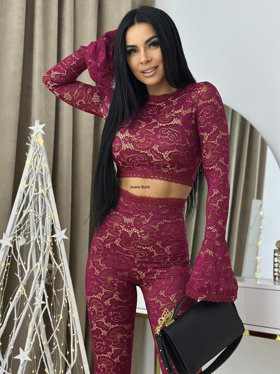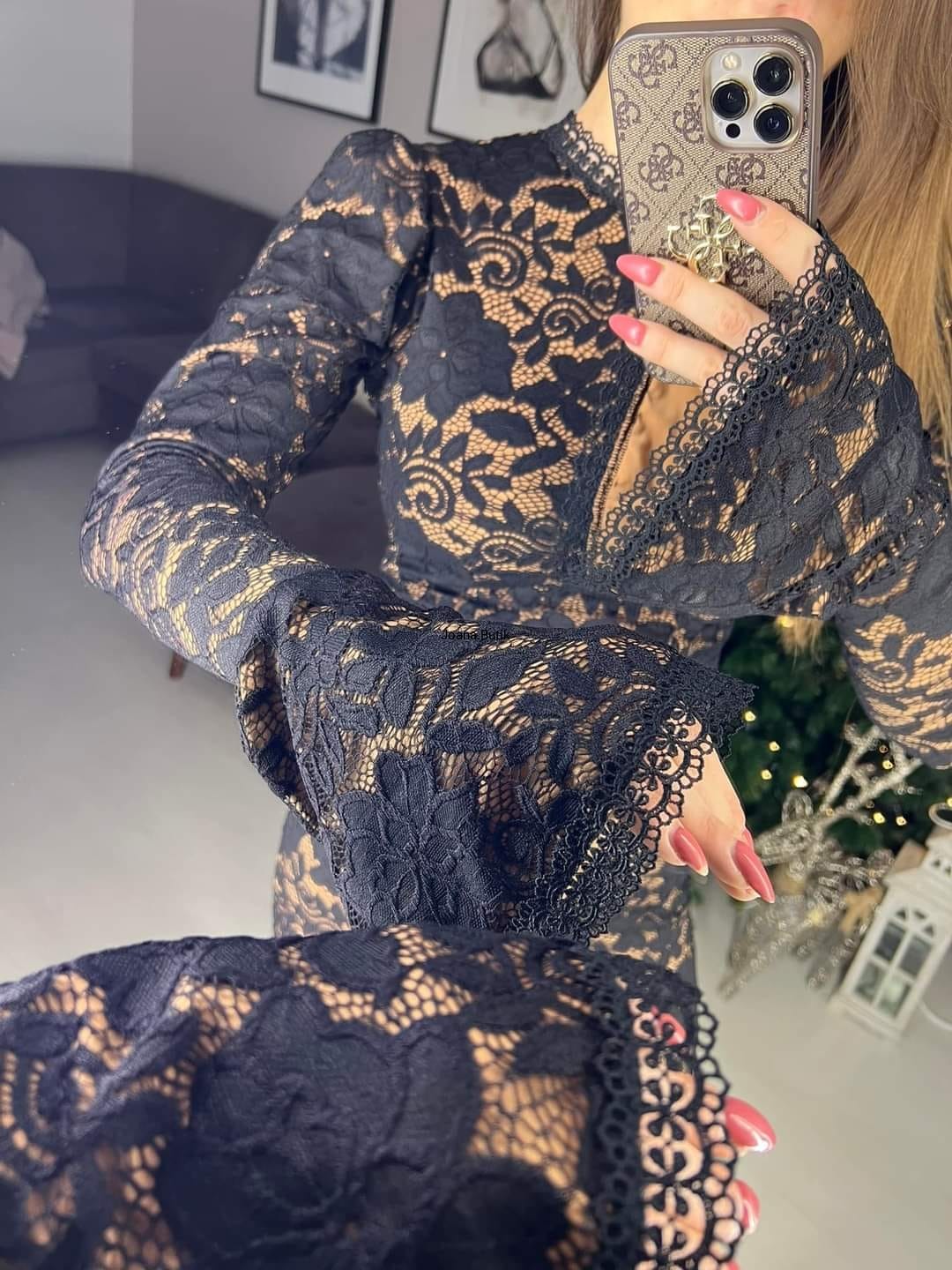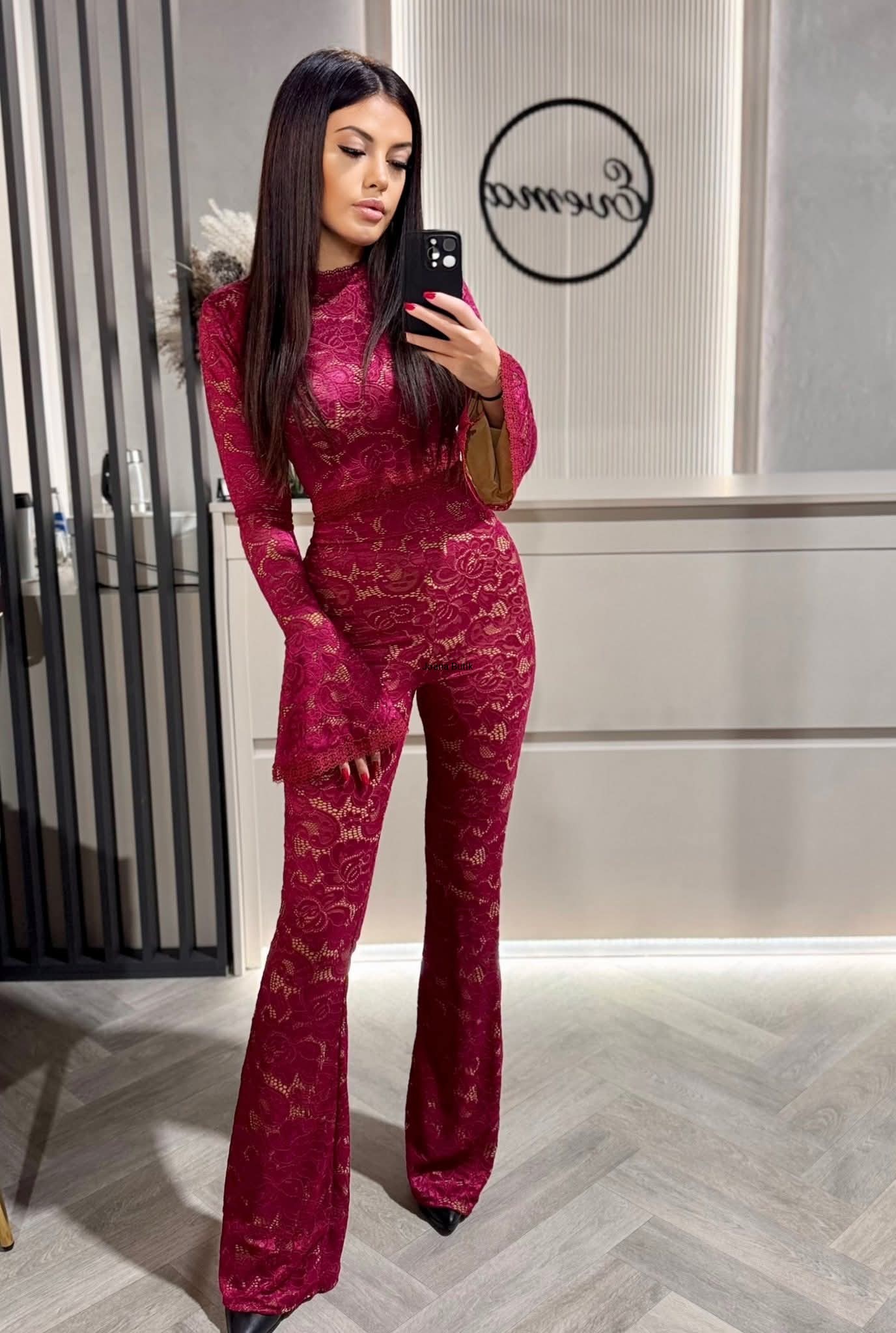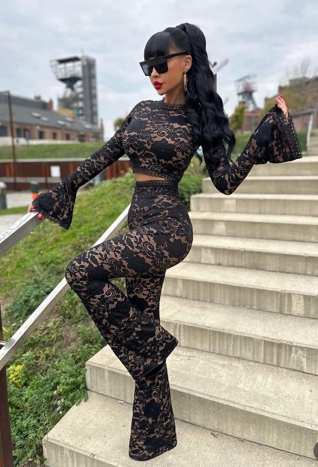 Zjawiskowy, elegancki komplet uszyty z najwyższej jakości czarnej koronki podszytej cielistym komfortowym materiałem. Komplet składa się ze spodni oraz bluzki. Spodnie z rozszerzaną nogawką oraz bardzo wysokim stanem obłędnie podkreśla talię. Wykończone w pasie zjawiskową ażurową koronką. Bluzka posiada przepięknie zdobione rozszerzane rękawy. Bluzka zapinana z tyłu na zamek. Spodnie również zapinane z tyłu na zamek. Komplet robi niesamowite wrażenie. Produkt polski. Jakość premium. Materiał lekko elastyczny. Wymiary XS: szerokość od pachy do pachy 86 cm- 90 cm długość bluzki 36 cm długość rękawa 70 cm pas/ talia 64 cm- 68 cm biodra 82- 94 cm długość całkowita spodni 120 cm długość wewnętrzna nogawki 89 cm stan 35 cm Wymiary S: szerokość od pachy do pachy 88 cm- 92 cm długość bluzki 37 cm długość rękawa 71 cm pas/ talia 66 cm-70 cm biodra 84 cm-96 cm długość całkowita spodni 121 cm długość wewnętrzna nogawki 90 cm stan 36 cm Wymiary M: szerokość od pachy do pachy 90 cm- 94 cm długość bluzki 38 cm długość rękawa 72 cm pas/ talia 68 cm-72 cm biodra 86 cm-98 cm długość całkowita spodni 122 cm długość wewnętrzna nogawki 91 cm stan 37 cm