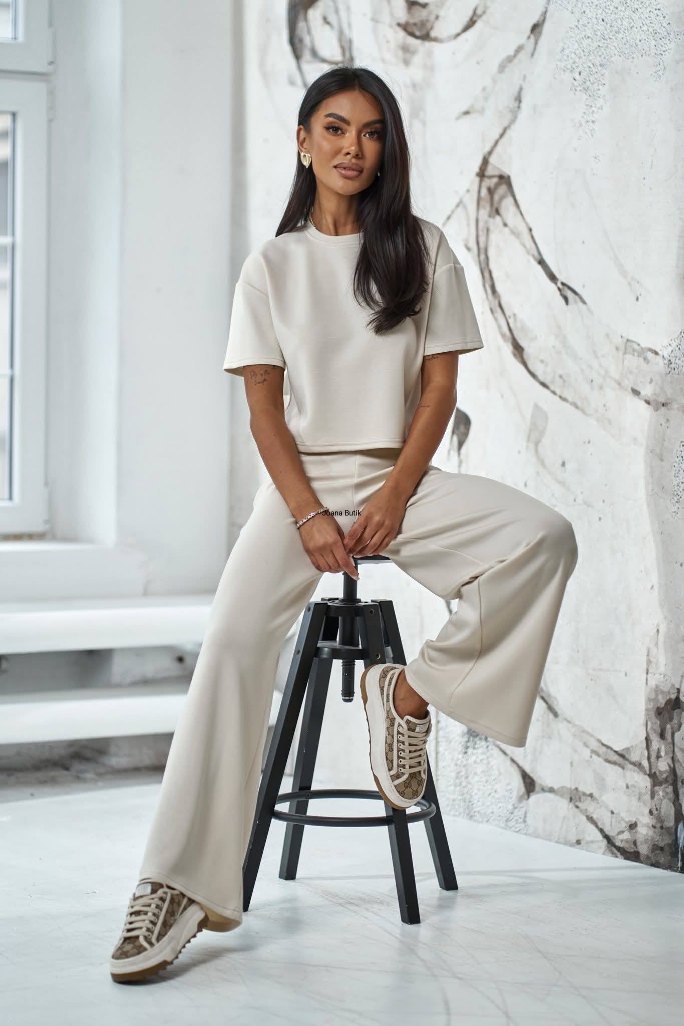 Skład: 48% wiskoza, 44% poliester, 8% elastan Połączenie bluzki o długości short ze spodniami o szerokim kroju. Basicowy, luźny styl. Wymiary S: Bluzka Długość całkowita: 47 cm Obwód w biuście: 100 cm Długość rękawa od pachy: 8 cm Spodnie Długość całkowita: 104 cm Długość nogawki wew.: 78 cm Wysokość stanu: 26 cm Obwód w pasie (gumka): od 66 cm do 86 cm po rozciągnięciu Obwód bioder: od 96 cm do 112 cm po rozciągnięciu Wymiary M: Bluzka Długość całkowita: 47 cm Obwód w biuście: 104 cm Długość rękawa od pachy: 8 cm Spodnie Długość całkowita: 105 cm Długość nogawki wew.: 78 cm Wysokość stanu: 27 cm Obwód w pasie (gumka): od 70 cm do 90 cm po rozciągnięciu Obwód bioder: od 100 cm do 116 cm po rozciągnięciu Wymiary L: Bluzka Długość całkowita: 47 cm Obwód w biuście: 108 cm Długość rękawa od pachy: 9 cm Spodnie Długość całkowita: 104 cm Długość nogawki wew.: 78 cm Wysokość stanu: 26 cm Obwód w pasie (gumka): od 74 cm do 94 cm po rozciągnięciu Obwód bioder: od 104 cm do 120 cm po rozciągnięciu Ubrania mierzone na płasko! Poszczególne wymiary mogą różnić się +/- 2 cm. Produkt polski.