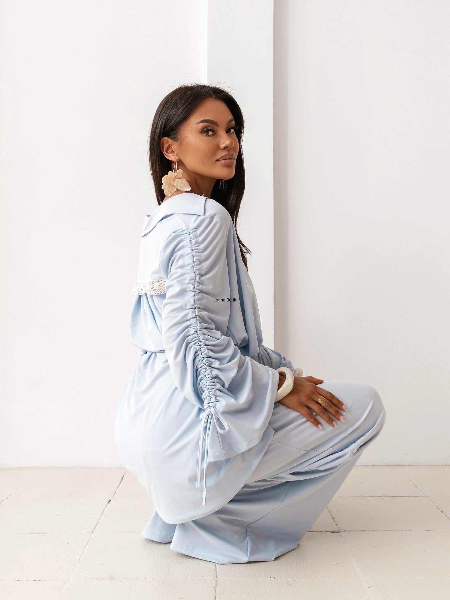 Zjawiskowy Komplet Boho: Top z Koronką i Szerokie Spodnie Postaw na kobiecość i swobodę z naszym najnowszym kompletem w kolorze głębokiego, czekoladowego brązu. To idealna propozycja dla kobiet, które kochają styl boho-chic połączony z nutką nowoczesnej elegancji. Góra: Dopasowany Top z Charakterem Krój: Krótki fason typu crop top z głębokim dekoltem, który pięknie eksponuje linię biustu i ramion. Detale: Dół topu wykończony jest szeroką, ażurową koronką w kolorze kremowym, która dodaje całości lekkości i romantycznego wyrazu. Regulowane ramiączka Komfort: Dzięki elastycznej gumce z tyłu, top idealnie dopasowuje się do sylwetki, zapewniając wygodę noszenia przez cały dzień bez przesuwania się materiału. Dół: Stylowe Spodnie z Wysokim Stanem Fason: Szerokie nogawki typu wide leg to hit sezonu – nie tylko optycznie wydłużają nogi, ale też gwarantują pełną swobodę ruchów. Talia: Elastyczny pas (gumka) podkreśla talię i sprawia, że spodnie są niezwykle komfortowe, niezależnie od typu sylwetki. Materiał: Lekka tkanina o subtelnej strukturze doskonale układa się w ruchu. Skład: 95% wiskoza, 5% elastan Z czym nosić? Zestaw świetnie komponuje się z dodatkami ze słomy – koszykiem, dużym kapeluszem oraz złotą biżuterią. Możesz go nosić do sandałków na płaskiej podeszwie lub eleganckich klapek na obcasie. Rozmiar uniwersalny biust do 98 cm długość topu (bez ramiączek) 27 cm pas 62 cm- 90 cm biodra 126 cm długość całkowita 107 cm długość wewn nogawki 84 cm stan 30 cm Dlaczego warto go mieć? Możesz nosić go jako komplet lub łączyć elementy oddzielnie z innymi częściami garderoby. Idealny na letnie imprezy, wakacyjne spacery czy wieczorne wyjścia ze znajomymi. Unikalne połączenie koloru ziemi z delikatną koronką.