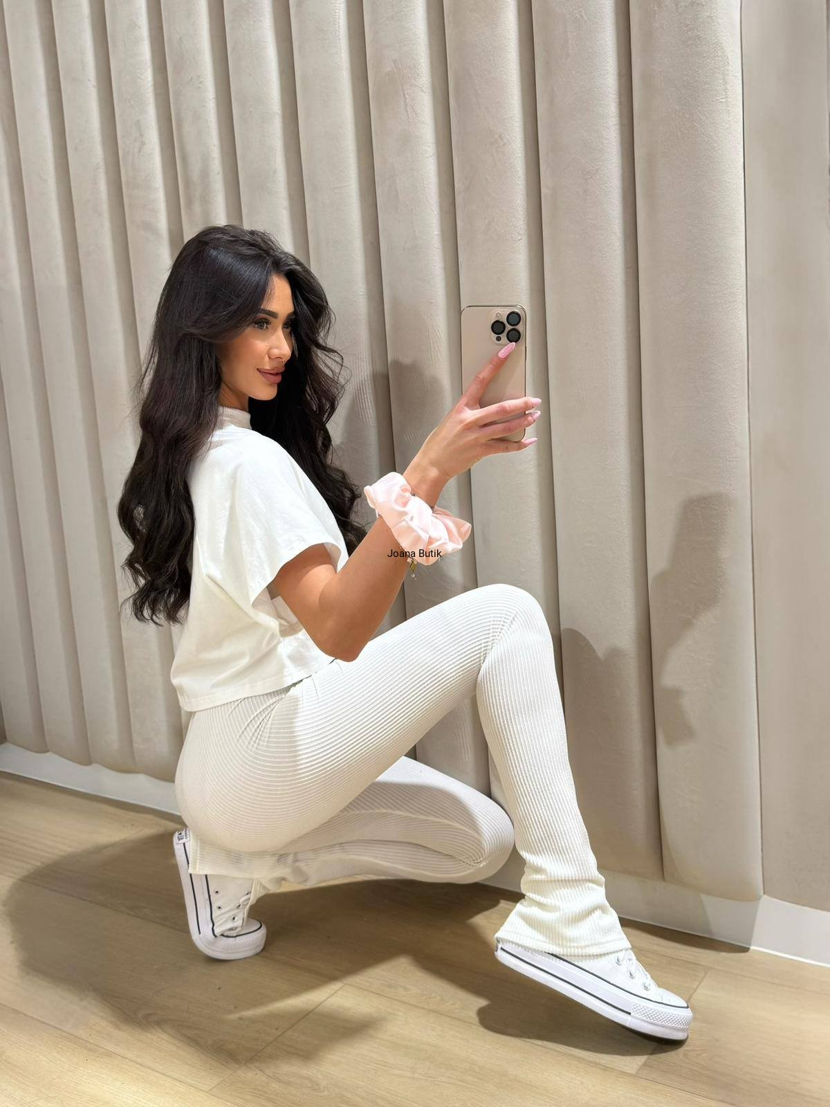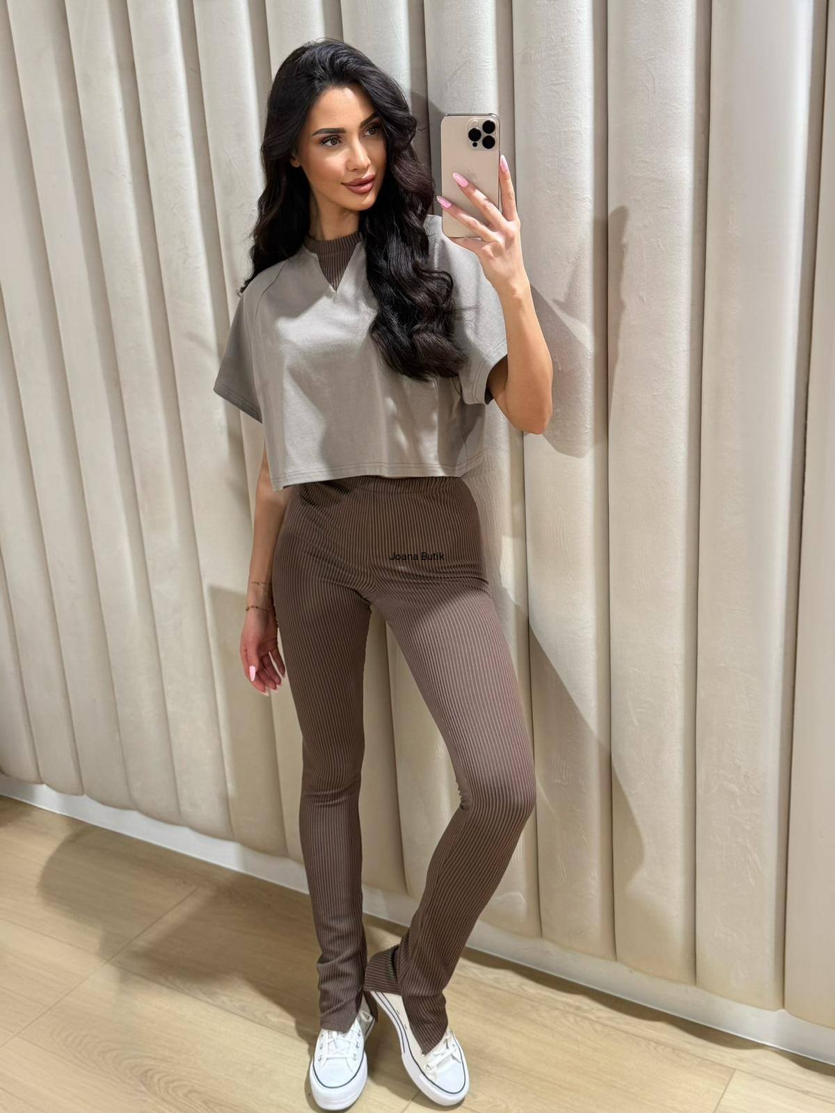 Modelujący,komfortowy komplet M.Tissu składający się z bluzki oraz legginsów. Krótka bluzka z krótkimi rękawami idealnie łączy się z fakturą legginsów. Modelujące legginsy z wysokim stanem, posiadają wewnętrzne rozcięcia na nogawkach dzięki którym model zaskakuje oryginalnym fasonem. W pasie gumka. Materiał elastyczny, dopasowujący się do sylwetki. Top uniwersalny, spodnie XS/S lub M/L WYMIARY TOP: od pachy do pachy 120 cm długość całkowita 43 cm WYMIARY LEGGINSY XS/S pas 46 cm- 80 cm biodra 64 cm- 100 cm długość całkowita 110 cm WYMIARY LEGGINSY M/L pas 52 cm- 88 cm biodra 68 cm- 108 cm długość całkowita 111 cm