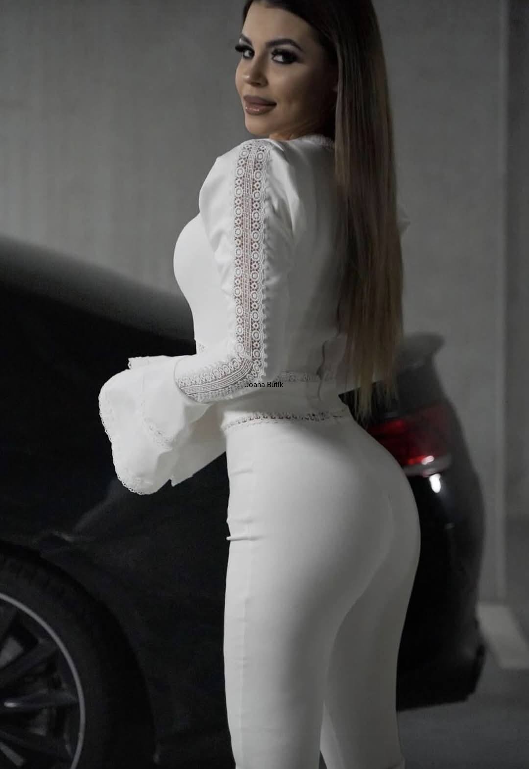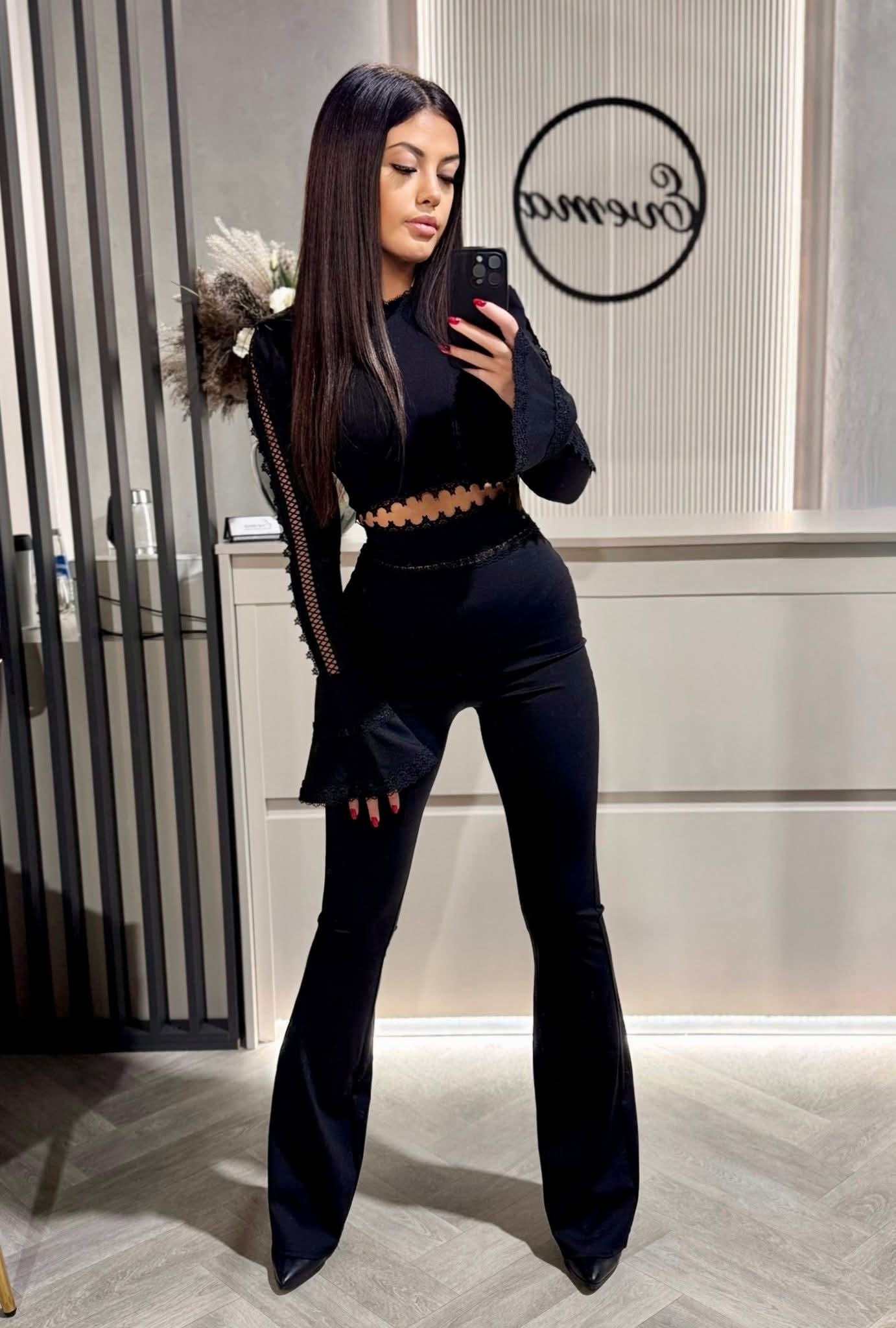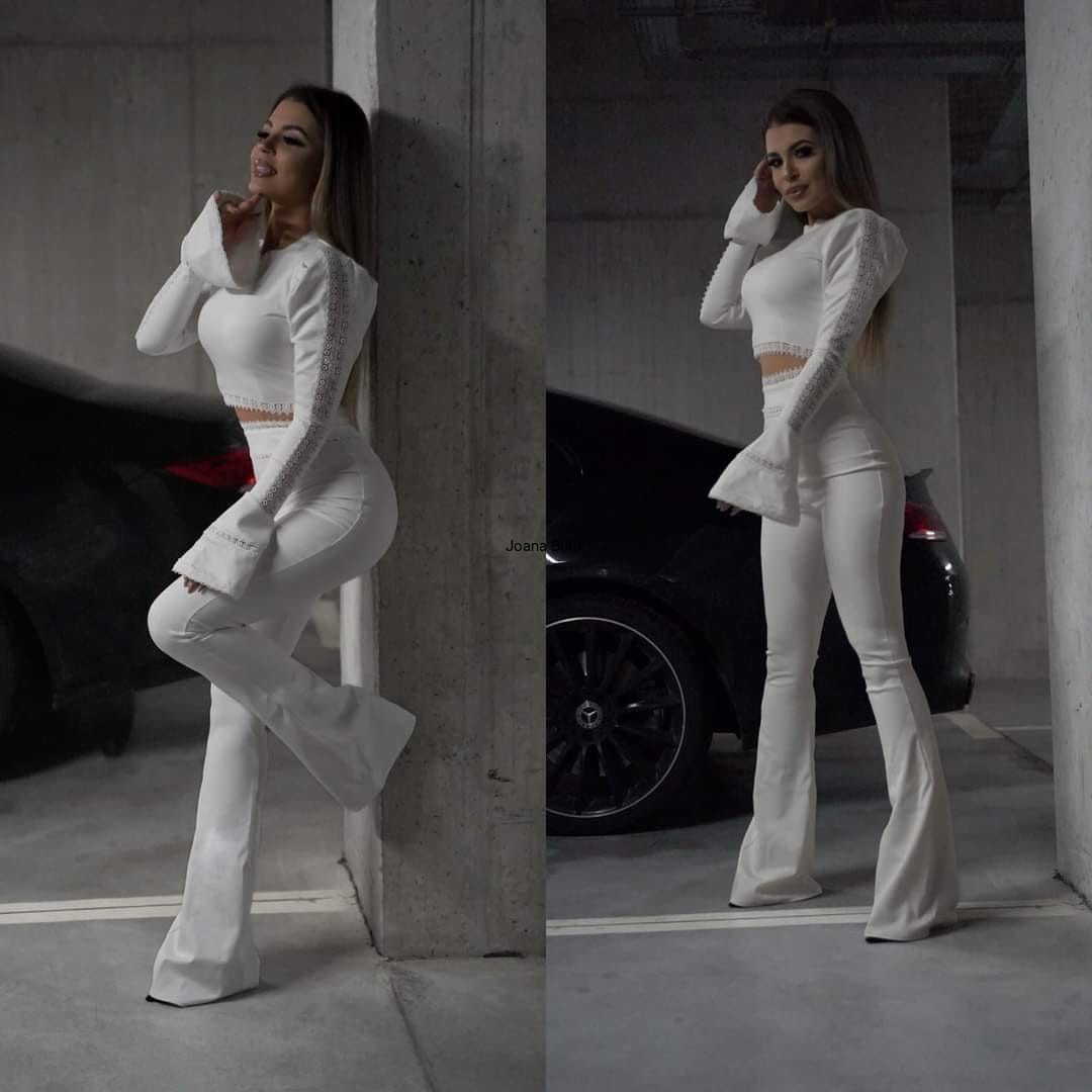 Zjawiskowy, elegancki komplet uszyty z najwyższej jakości materiału. Komplet składa się ze spodni oraz bluzki. Spodnie z rozszerzaną nogawką oraz bardzo wysokim stanem obłędnie podkreśla talię. Wykończone w pasie zjawiskową koronką oraz ażurową wstawką. Bluzka posiada przepięknie zdobione rozszerzane rękawy wzdłuż których przechodzi koronka. Ramiona delikatnie bufiaste co sprawia, że komplet nabiera uroku. Bluzka zapinana z tyłu na zamek. Komplet robi niesamowite wrażenie. Produkt polski. Jakość premium. Materiał lekko elastyczny. Wymiary XS: szerokość od pachy do pachy 86 cm- 90 cm długość bluzki 36 cm długość rękawa 70 cm pas/ talia 64 cm- 68 cm biodra 82- 94 cm długość całkowita spodni 120 cm długość wewnętrzna nogawki 89 cm stan 35 cm Wymiary S: szerokość od pachy do pachy 88 cm- 92 cm długość bluzki 37 cm długość rękawa 71 cm pas/ talia 66 cm-70 cm biodra 84 cm-96 cm długość całkowita spodni 121 cm długość wewnętrzna nogawki 90 cm stan 36 cm Wymiary M: szerokość od pachy do pachy 90 cm- 94 cm długość bluzki 38 cm długość rękawa 72 cm pas/ talia 68 cm-72 cm biodra 86 cm-98 cm długość całkowita spodni 122 cm długość wewnętrzna nogawki 91 cm stan 37 cm