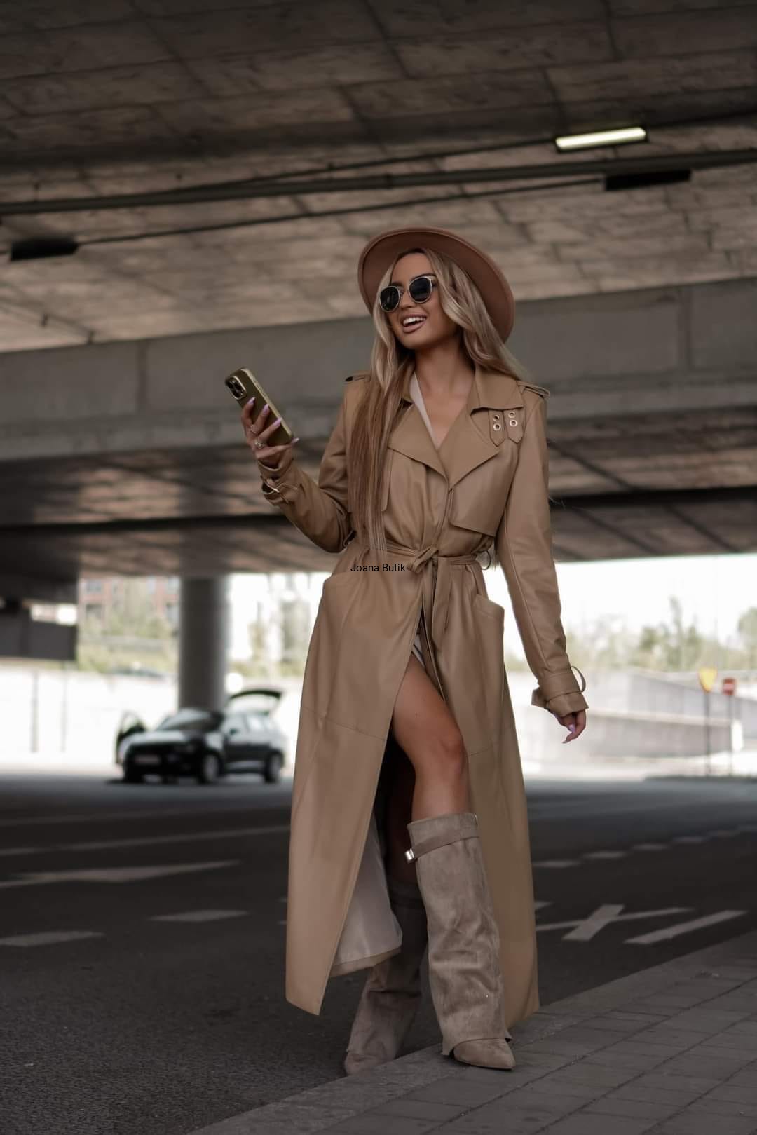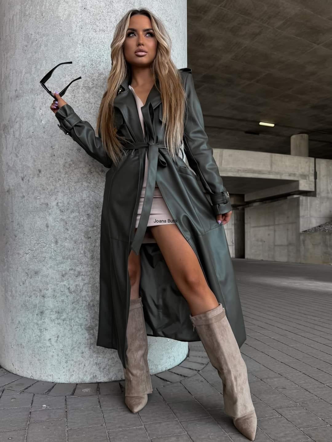 Damski, długi płaszcz wykonany z wysokiej jakości skóry ekologicznej to elegancka i stylowa propozycja na chłodniejsze dni. Materiał wierzchni imituje prawdziwą skórę, dodając całości wyrafinowanego charakteru. Płaszcz jest dopasowany do sylwetki, podkreślając talię za pomocą paska do wiązania, który umożliwia regulację obwodu. Złote elementy, takie jak ozdobne klamry nadają mu luksusowego wyglądu, idealnie komponując się w ciepły odcień carmelu. Płaszcz posiada dwie praktyczne, boczne kieszenie. Klapa przednia ozdobiona dyskretnym, złotym logo. Posiada podszewkę. Płaszcz nie posiada zapięcia. Produkt polski Wymiary: od pachy do pachy do 104 cm talia (regulacja paskiem) 98 cm długość całkowita 133 cm