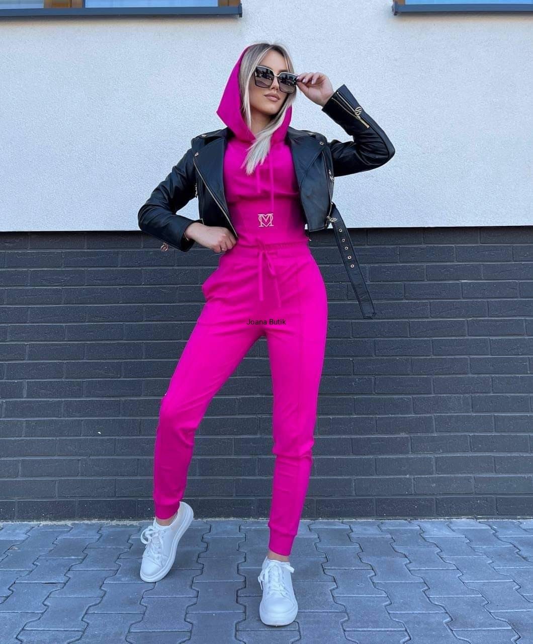 Ciekawy komplet dresowy, bluza i spodnie. Bluza posiada długie rękawy zakończone ściągaczami, kaptur oraz wysoki pas zwężający dół bluzy, odpinany suwakiem z lewej strony. Spodnie są prostego kroju z przeszyciem w kant. Szeroka guma w pasie oraz troczki podkreślają talię. Całość zdobi złoty haft "M" z serduszkiem. Propozycja dla kobiet które cenią sobie wygodę oraz modny wygląd. Komplet nie posiada ocieplenia. Rozmiary: XS/S/M/L XS/34 BLUZA dł. całkowita - 47 cm szerokość pod pachami - 44-49 cm x2 szerokość na dole - 30-36 cm x2 dł. rękawa zew/wew. - 58/50 cm SPODNIE dł. całkowita - 99 cm szerokość w pasie - 27-32 cm x2 szerokość w biodrach - 42-48 cm x2 stan przód/tył - 30/33 cm dł. nogawki wew.- 72 cm S/36 BLUZA dł. całkowita - 49 cm szerokość pod pachami - 48-53 cm x2 szerokość na dole - 32-38 cm x2 dł. rękawa zew/wew. - 58/50 cm SPODNIE dł. całkowita - 99 cm szerokość w pasie - 29-34 cm x2 szerokość w biodrach - 45-50 cm x2 stan przód/tył - 30/33 cm dł. nogawki wew.- 73 cm M/38 BLUZA dł. całkowita - 50 cm szerokość pod pachami - 50-55 cm x2 szerokość na dole - 33-39 cm x2 dł. rękawa zew/wew. - 59/51 cm SPODNIE dł. całkowita - 100 cm szerokość w pasie - 31-36 cm x2 szerokość w biodrach - 49-55 cm x2 stan przód/tył - 30/33 cm dł. nogawki wew.- 73 cm L/40 BLUZA dł. całkowita - 50 cm szerokość pod pachami - 52-57 cm x2 szerokość na dole - 35-41 cm x2 dł. rękawa zew/wew. - 59/51 cm SPODNIE dł. całkowita - 102 cm szerokość w pasie - 34-39 cm x2 szerokość w biodrach - 51-56 cm x2 stan przód/tył - 31/34 cm dł. nogawki wew.- 74 cm Skład z metki spodnie: 95% bawełna, 5% elastan Polski produkt