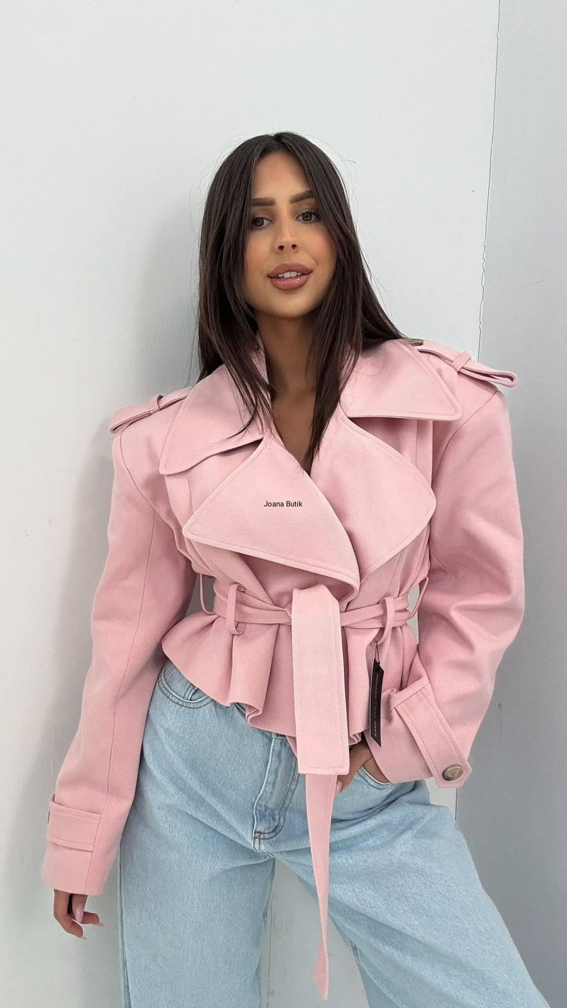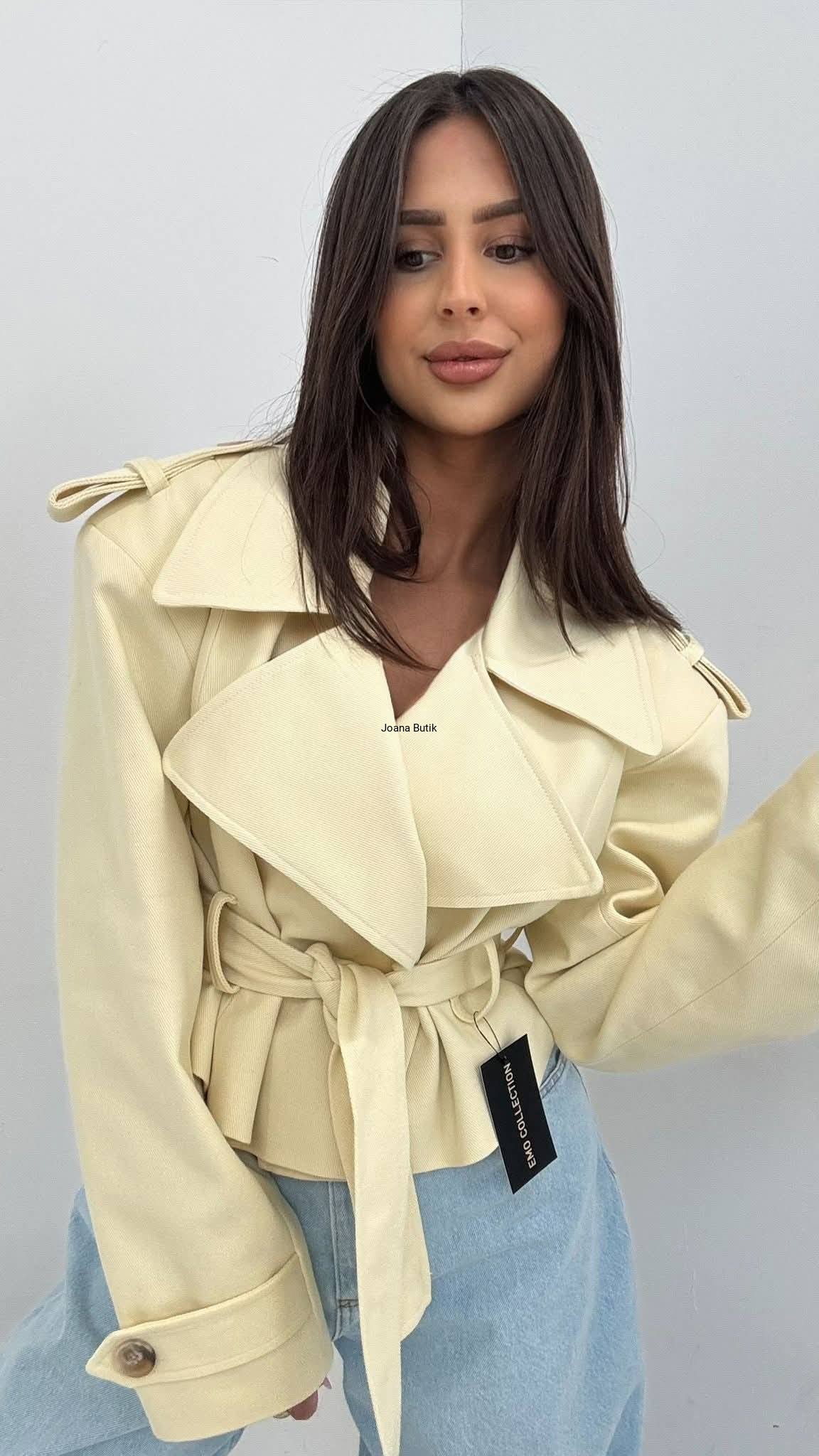 Stylowy, krótki płaszcz w oversize'owym kroju, który zapewnia maksymalny komfort i swobodę noszenia. Wyposażony w pasek do wiązania, podkreśla talię i dodaje sylwetce nowoczesnego charakteru. Materiał 100% Bawełna, Podszewka - 100%Poliester