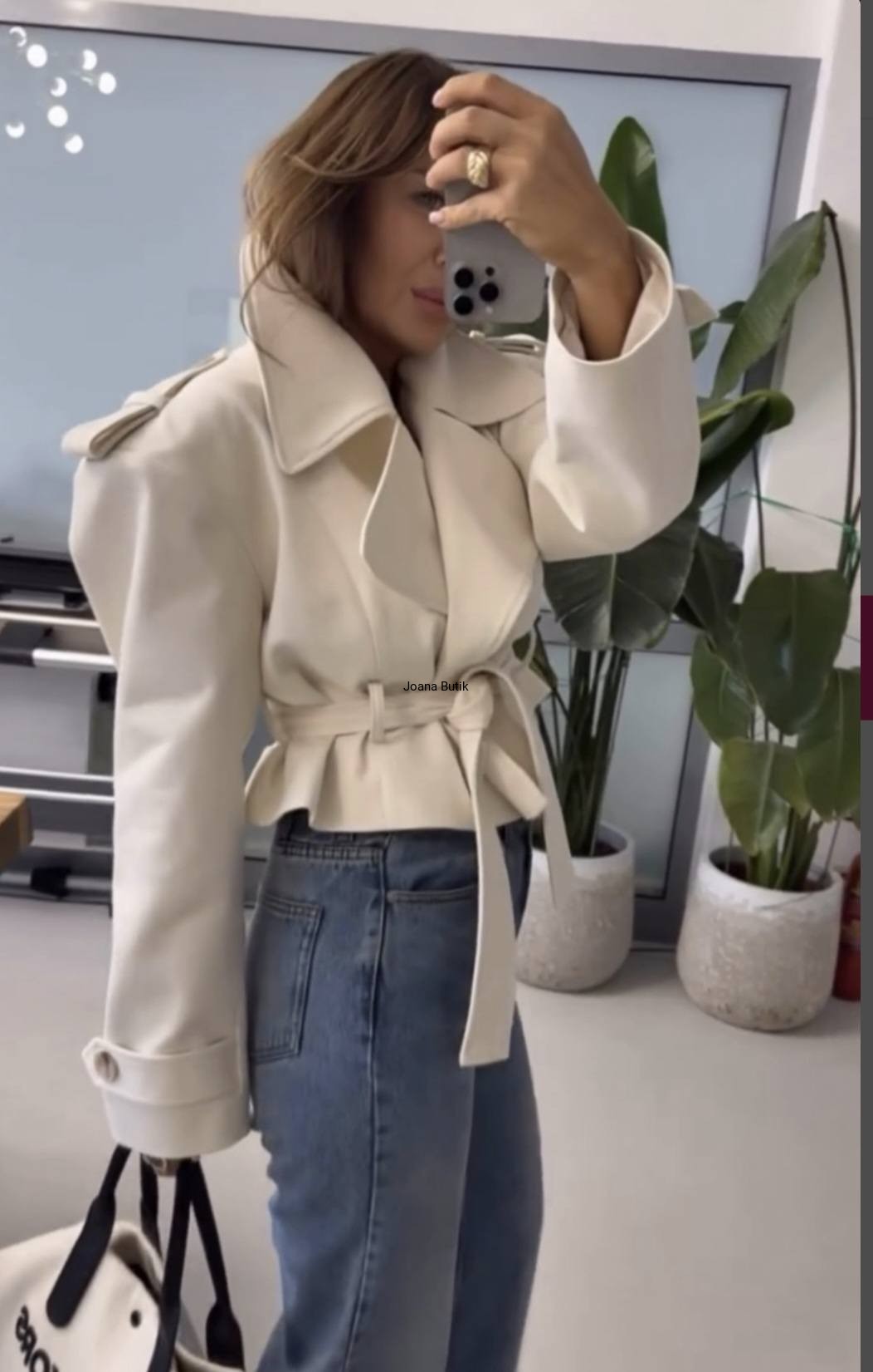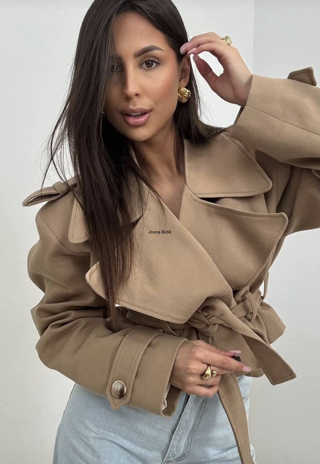Stylowy, krótki płaszcz w oversize'owym kroju, który zapewnia maksymalny komfort i swobodę noszenia. Wyposażony w pasek do wiązania, podkreśla talię i dodaje sylwetce nowoczesnego charakteru. Materiał 100% Bawełna, Podszewka - 100%Poliester