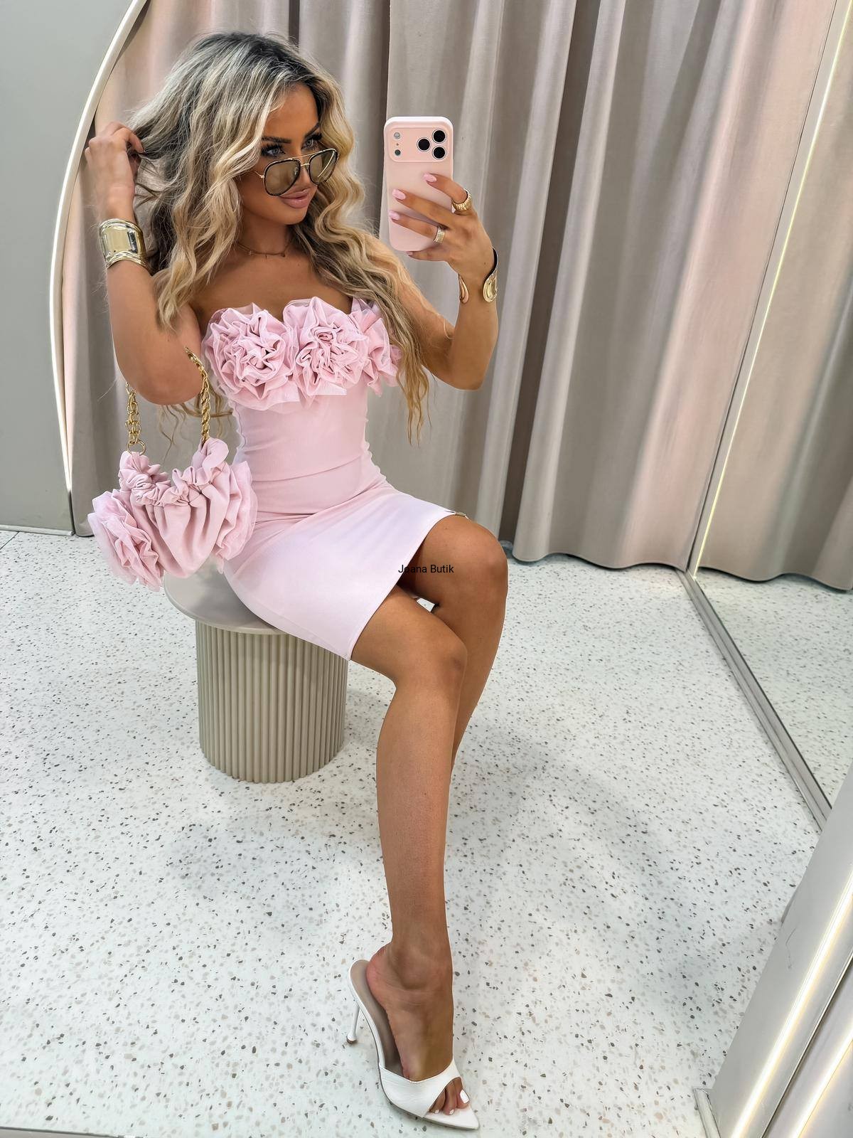 Obłędnie piękna sukienka typu tuba wykonana z bardzo elastycznego materiału w delikatny prążek. Przód sukienki zdobiony jest dużymi różami. Z tyłu wycięcie eksponujące nogi. Góra sukienki posiada gumkę co idealnie dopasuje się do Twojego biustu i pozwoli poczuć się komfortowo. Ozdobiona dyskretnym, złotym logo na dole. W zestawie znajduje się przepiękna wizytowa torebka wykonana z tego samego materiału co sukienka. Torebka posiada grubsze, złote łańcuszki oraz dwie róże stanowiące idealny komplet z sukienką. Rozmiar jest uniwersalny- polecamy na rozmiar 34-38. Wymiary: od pachy do pachy 58 cm-94 cm talia 64 cm- 88 cm biodra 74 cm- 98 cm długość całkowita 123 cm